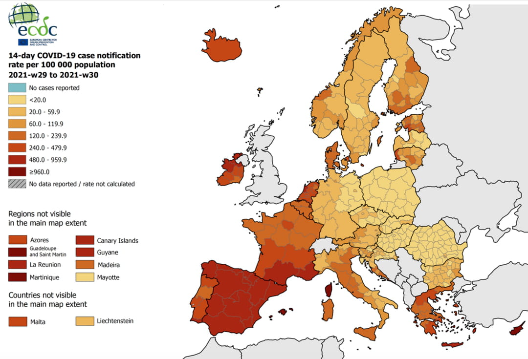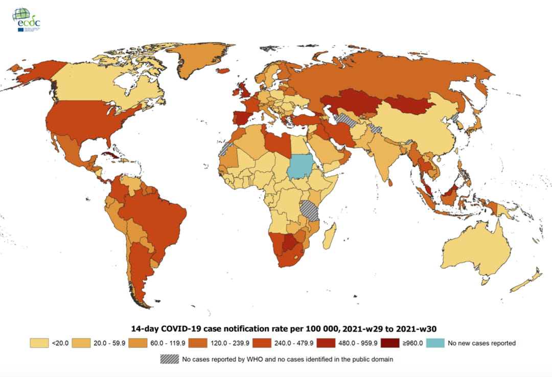 Selon l'ECDC, l'Europe totalise 58 986 270 cas de Covid-19 du 31 décembre 2019 au 1er août 2021 et 1 203 880 morts.