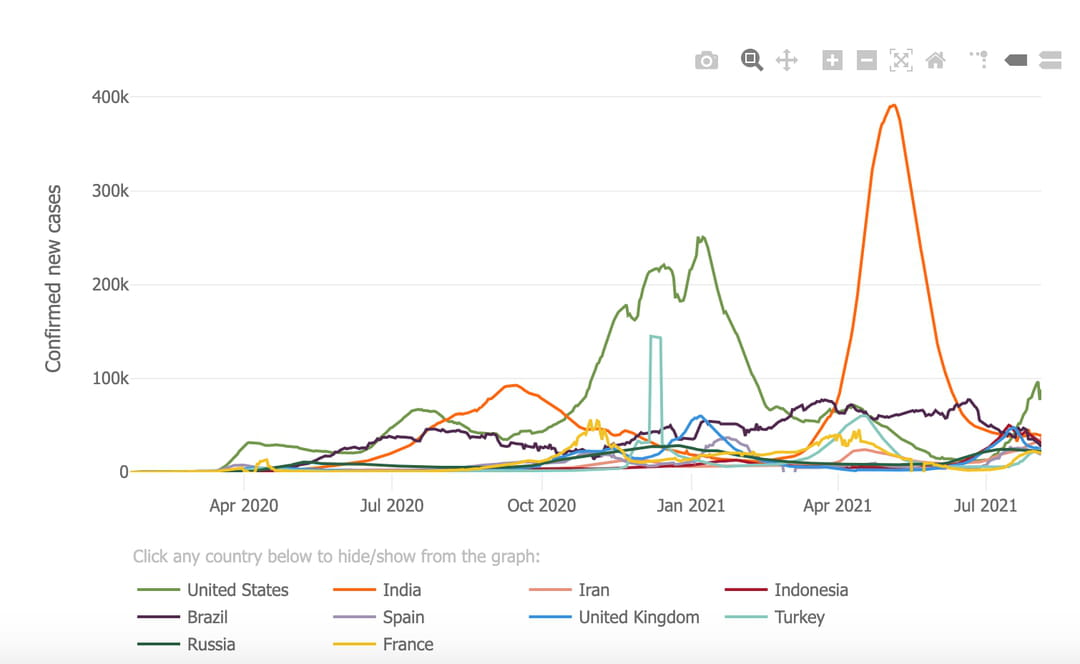 L'épidémie de Covid repart comme le montrent les courbes de l'Université Johns Hopkins, dans plusieurs pays : Etats-Unis, Inde, Iran, Turquie, France, Mexique, Thaïlande, Malaisie, Bangladesh, Irak, Japon, Cuba.