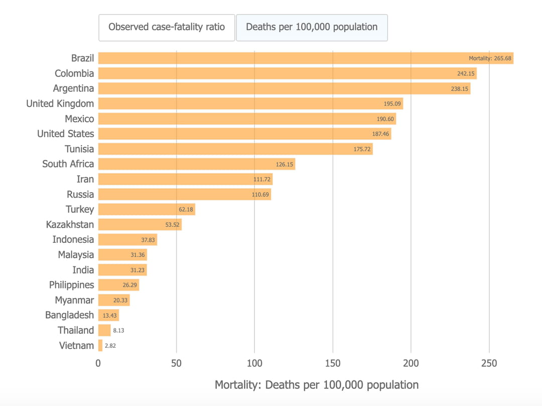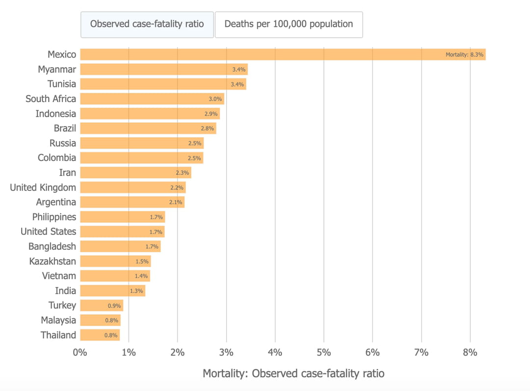 L'un des moyens les plus importants pour mesurer l'impact de l'épidémie de Covid-19 sur un pays est la mortalité. Les pays du monde entier ont signalé des ratios de létalité très différents (nombre de décès pour 100 cas confirmés). Comme le souligne l'Université Johns Hopkins "les différences dans les chiffres de mortalité peuvent être causées par les différences du nombre de personnes testées, la démographie (la mortalité a tendance à être plus élevée dans les populations plus âgées), les caractéristiques du système de santé (la mortalité augmente plus quand les hôpitaux sont débordés et disposent de moins de ressources)".