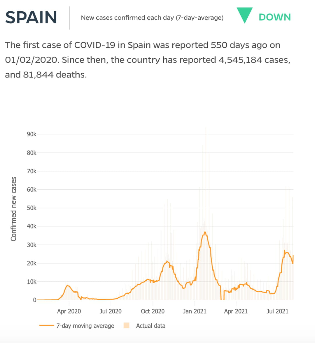 L'Espagne a rouvert ses frontières à toutes les personnes vaccinées depuis le 7 juin. Le port du masque obligatoire pour toute personne de plus de 6 ans dans les espaces clos recevant du public ou ouverts au public, dans tous les espaces à l'air libre et dans les transports.
