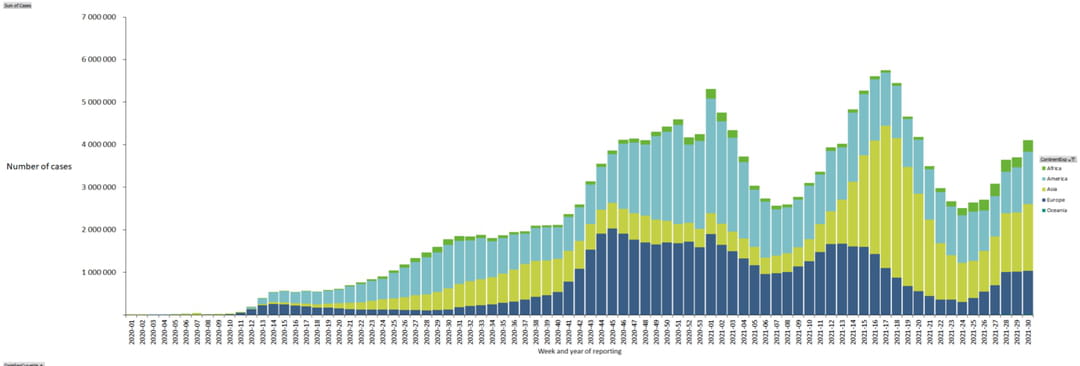Au 8 août 2021, plus de 202 millions de personnes ont été testées positives au virus selon les comptages de l'Université Johns Hopkins (202 444 628). Selon les chiffres du Centre européen de prévention et de contrôle des maladies arrêtés à la semaine 31 (5 août), 198 964 259 cas ont été confirmés depuis le 31 décembre 2019. Ces chiffres varient selon les définitions de cas appliquées dans chaque pays et leurs stratégies de dépistage.