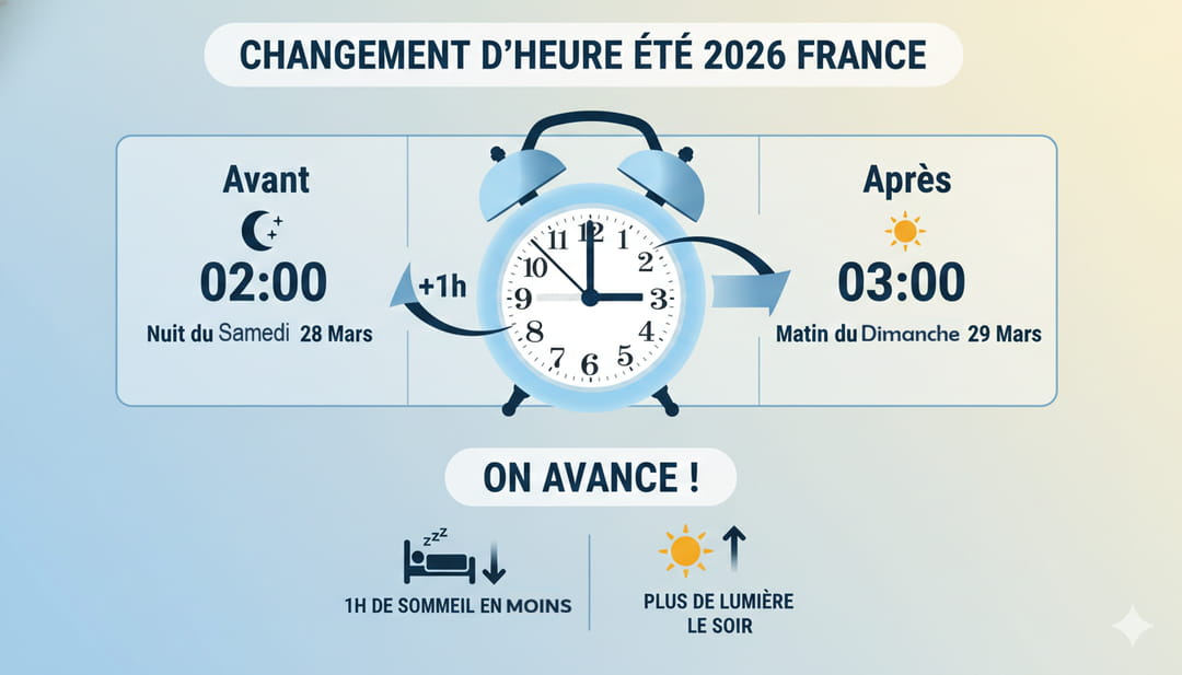 En 2026, le passage à l'heure d'été s'effectue officiellement dans la nuit du samedi 28 au dimanche 29 mars.
