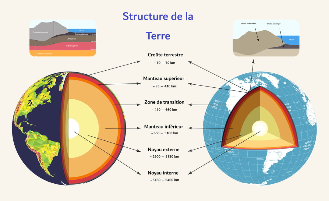 Il s'agit de la couche la plus externe et la plus fine de la planète. C'est une enveloppe rigide et solide qui "flotte" sur une couche beaucoup plus épaisse et chaude appelée le manteau. Contrairement à ce qu'on pourrait croire, elle n'est pas d'un seul tenant : elle est cassée en plusieurs morceaux que l'on appelle les plaques tectoniques. La croûte superficielle désigne la toute petite partie supérieure de la croûte (les premiers centaines de mètres), celle qui est en contact direct avec l'air, l'eau et la vie. C'est là que l'on trouve les nappes phréatiques (notre réserve d'eau potable), le pétrole ou le gaz, car la roche y est souvent plus poreuse et fissurée.