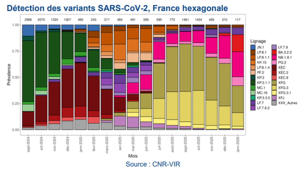En janvier 2026, en France, le variant XFG reste le plus fréquent. Un autre variant, appelé BA.3.2.2, récemment apparu sur le territoire, représente environ 16 % des virus analysés. Si l'on prend en compte toutes leurs sous-variantes, XFG regroupe un peu plus de 4 cas de Covid sur 10 et NB.1.8.1 environ 3 sur 10 parmi les prélèvements étudiés. Le variant BA.3.2 a été classé "sous surveillance" par l'Organisation mondiale de la Santé en décembre 2025. Repéré pour la première fois en Afrique du Sud fin 2024, il présente de nombreuses modifications sur sa protéine Spike, la clé qui lui permet d'entrer dans les cellules. En laboratoire, il semble mieux échapper aux anticorps, mais rien n'indique pour l'instant qu'il soit plus contagieux ou qu'il provoque des formes plus graves. L'OMS estime donc que le risque pour la population reste faible à ce stade. Au niveau mondial, 866 cas de BA.3.2 ont été recensés dans la base internationale GISAID, soit une part très limitée des virus séquencés. En France, 19 cas ont été identifiés en janvier.