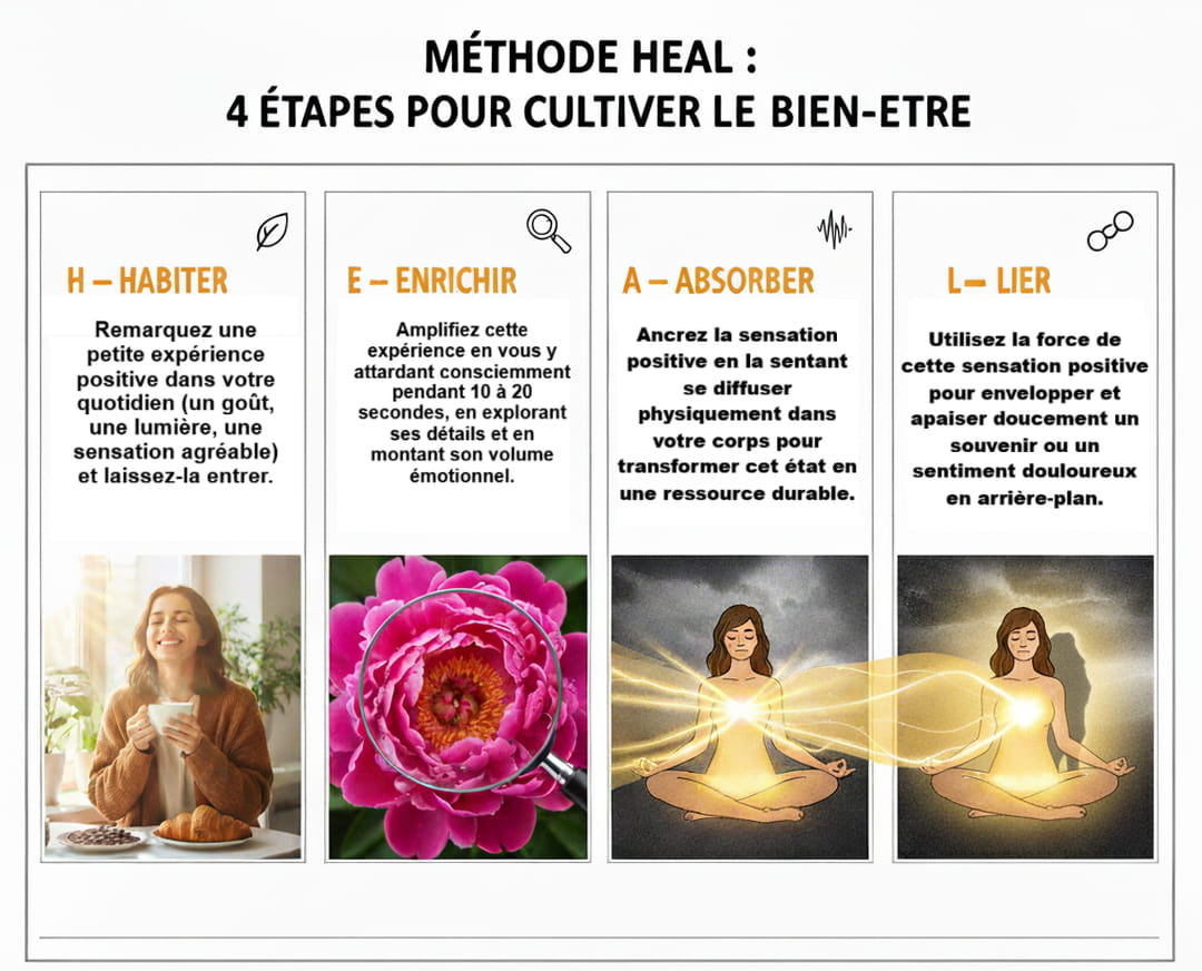Pour "reprogrammer" son cerveau, le psychologue Rick Hanson a mis au point une méthode simple à la portée de tous. Basée sur la neuroplasticité soit la capacité du cerveau à se modifier par l'expérience, la méthode baptisée "HEAL" repose sur 4 étapes : le H (pour "habiter") consiste à trouver une petite expérience agréable (la chaleur du soleil, le bon goût d'un aliment, l'odeur d'une fleur), le E (pour "enrichir") propose de s'attarder dessus consciemment pendant 10 à 20 secondes, le A (pour "absorber") consiste à laisser l'expérience s'infiltrer et s'ancrer dans le corps, de la tête aux pieds. Concrètement, il faut imaginer que cette émotion positive (calme, gratitude, satisfaction) s'infiltre et se diffuse en vous. Enfin, le L (pour "lier") consiste à superposer cette sensation positive à un souvenir douloureux, une préoccupation, une anxiété ou une critique pour l'apaiser, tel un baume réconfortant.