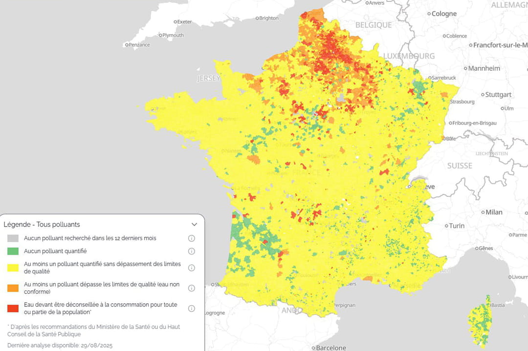 En 2025, plus de 87% des UDI sont conformes à la réglementation (et sans dépassement des limites sanitaires) selon Générations Futures. Mais il existe de fortes inégalités territoriales : certaines zones sont davantage concernées par des non-conformités, notamment pour les métabolites de pesticides. L'outil signale que dans environ 3% des UDI (soit 709 réseaux) l'eau "peut faire l'objet de recommandations de restriction de la consommation" pour tout ou partie de la population. Certaines communes peuvent, par ailleurs, apparaître sans données : cela signifie que les analyses n'ont pas encore été publiées ou ne portent pas sur tous les polluants.