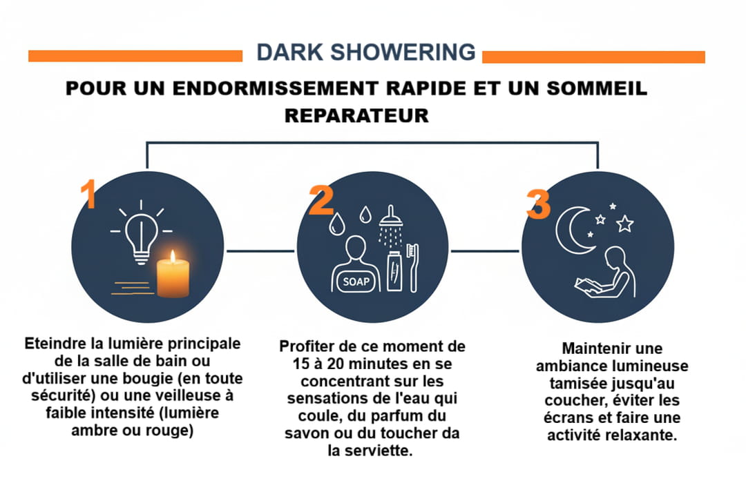 L'astuce consiste à prendre sa douche et à effectuer sa toilette du soir (démaquillage, nettoyage du visage, brossage de dents....) dans le noir ou, du moins, avec une lumière extrêmement tamisée. C'est ce que les américains appellent le "dark showering". Le mode d'emploi est d'une simplicité désarmante : il suffit d'éteindre la lumière principale de la salle de bain ou d'utiliser une bougie (en toute sécurité) ou une veilleuse à faible intensité (lumière ambre ou rouge de préférence). De profiter de ce moment de 15 à 20 minutes en se concentrant sur les sensations de l'eau qui coule, du parfum du savon ou du toucher de la serviette. Une fois sorti(e) de la douche, il est préférable de maintenir une ambiance lumineuse tamisée jusqu'au coucher.