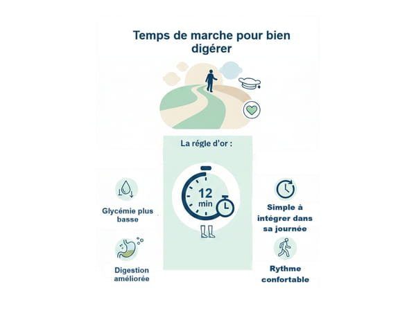 Mais combien de temps marcher pour bien digérer ? "12 minutes suffisent pour améliorer la digestion et atténuer sensiblement les brûlures d'estomac après le repas, en plus de réduire la rétention de gaz et les ballonnements", répond l'expert. C'est une durée très facile à intégrer dans une journée chargée. Une étude parue dans Diabetes Care confirme cette durée : c'est le chiffre qui est scientifiquement prouvé pour son efficacité sur les pics de sucre et les problèmes digestifs.