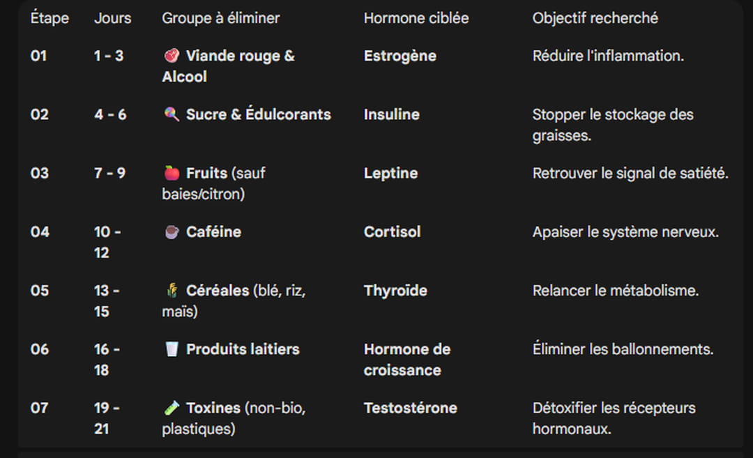 Cette approche, inventée par la gynécologue formée à Harvard, ne se contente pas de réduire les calories, elle mise sur une "réinitialisation" complète du corps. Le régime dure 21 jours (3 semaines) et se divise en 7 étapes. Tous les trois jours, vous éliminez un groupe d'aliments spécifique pour cibler une hormone précise. Les jours 1 à 3, on élimine la viande rouge et l'alcool pour cibler l'œstrogène. Les jours 4 à 6, on écarte les sucres et les édulcorants pour cibler l'insuline. Les jours 7 à 9, on bannit les fruits (sauf les baies et le citron) pour cibler la leptine. Les jours 10 à 12, c'est la caféine que l'on retire pour cibler le cortisol. Les jours 13 à 15, on retire les céréales (blé, riz, maïs) pour cibler la thyroïde et booster le métabolisme de base. Les jours 16 à 18, on élimine les produits laitiers pour cibler l'hormone de croissance et enfin, les jours 19 à 21, on retire tout ce qui est toxines (pesticides, plastiques) pour manger totalement bio et cibler la testostérone.