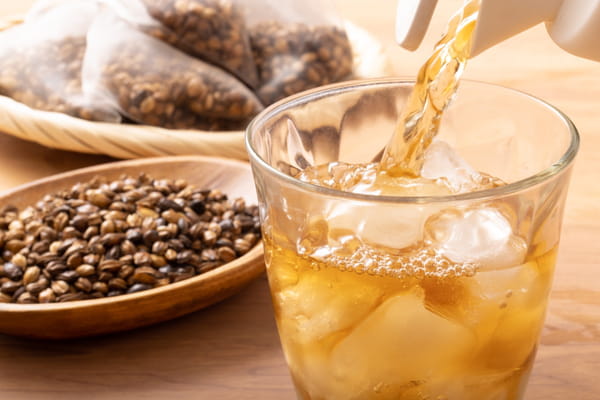 Cette boisson s'appelle le "mugicha", c'est une infusion d'orge torréfiée (les Japonais la surnomme le "thé d'orge" bien que ce ne soit pas du thé). Très appréciée pour son goût de noisette grillée, de pain chaud ou de café (mais sans l'amertume ni le côté excitant), on peut la boire aussi bien chaude en hiver que glacée en été.