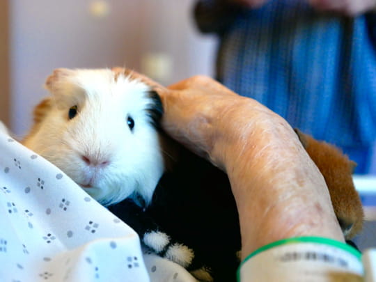 Les animaux qui participent à la médiation ne sont pas choisis au hasard. Il y a le chien bien sûr, fidèle ami de l'homme, mais aussi des lapins, des chinchillas, des souris et surtout le cochon d'Inde. "C'est une espèce qui se prête particulièrement à la médiation animale car il est très sociable avec l'humain et peu peureux" partage Alice François. "Le cochon d'Inde fait toujours son effet, confirme Angèle Bernaudat. On le met sur la table, il est à la portée des résidents, le contact est facile, c'est petit, doux, je n'ai jamais vu un résident réfractaire au cochon d'Inde. Il y a un fort aspect sensoriel dans ces moments-là." C'est un des bienfaits de la médiation animale : la stimulation des sens de la personne âgée par le toucher. Et ce n'est pas le seul.
