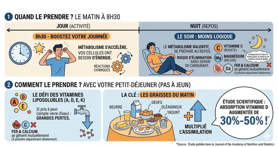 Cet horaire du milieu de petit-déjeuner répond à deux impératifs majeurs. Premièrement, un complexe contient des vitamines liposolubles (A, D, E, K). Si vous le prenez à jeun avec un simple verre d'eau, vous éliminez une grande partie de ces nutriments. En les associant aux graisses du matin (beurre, œufs, oléagineux, yaourt), vous multipliez leur assimilation par l'organisme. Une étude publiée dans le Journal of the Academy of Nutrition and Dietetics a d'ailleurs démontré que l'absorption de certains nutriments, comme la vitamine D, peut augmenter de 30% à 50% lorsqu'ils sont consommés avec un repas contenant des graisses plutôt qu'à jeun.