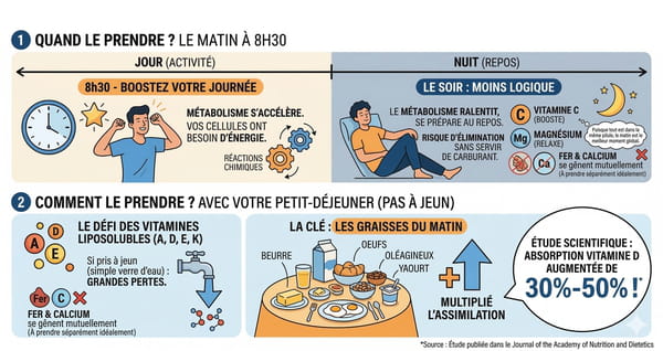 Le complexe multivitamines représente d'ailleurs un véritable défi de chronobiologie : il contient des éléments qui, idéalement, devraient être pris à des moments différents. Par exemple, le fer et le calcium se gênent mutuellement, tandis que la vitamine C booste là où le magnésium relaxe. Puisqu'on ne peut pas découper la pilule pour en séparer les ingrédients, les chercheurs et les nutritionnistes se sont accordés sur un moment stratégique qui maximise l'efficacité globale de la formule.