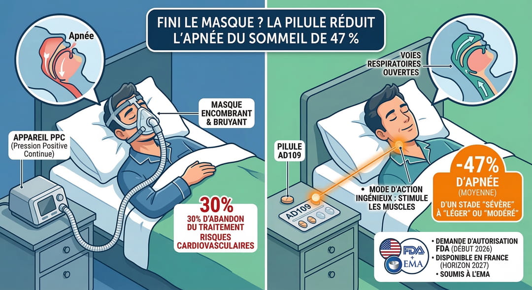 C'est une petite révolution pour les millions de personnes dont les nuits sont hachées par des arrêts respiratoires. Une étude clinique majeure vient de démontrer l'efficacité d'un médicament capable de diviser par deux la sévérité de l'apnée du sommeil. De quoi offrir une alternative sérieuse à l'encombrant masque de nuit.