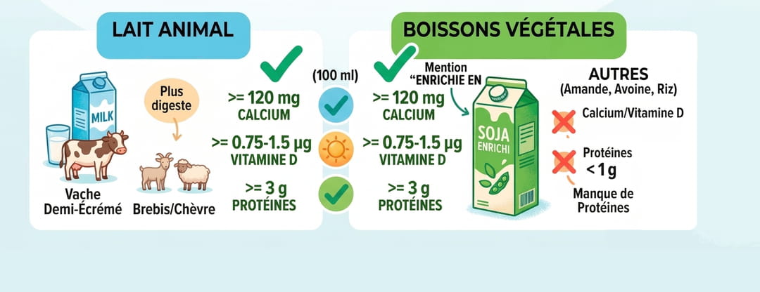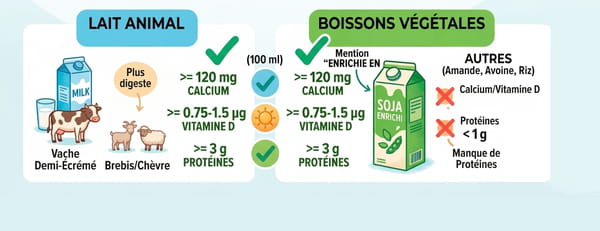 Si vous êtes vegan ou que vous n'aimez pas le lait, d'autres solutions existent : les eaux minérales riches en calcium (très bien assimilées), les produits laitiers dérivés (fromages, yaourts). Gare aux "faux amis" : les légumes contiennent du calcium, mais il est beaucoup moins bien assimilé par l'organisme que celui du lait ou de l'eau. Ils sont un bonus, mais rarement une source unique suffisante.