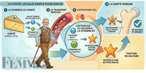 Vieillir en bonne santé, c'est avant tout se sentir libre de ses mouvements et conserver sa mobilité. C'est pourquoi préserver sa densité osseuse est crucial, en particulier dès 60-65 ans. À cet âge, les os deviennent plus poreux et le risque d'ostéoporose et de fracture grave (comme celle du col du fémur) augmente. Le minéral clé des os, c'est le calcium. "Mais consommer du calcium sans le fixer, c'est comme essayer de remplir un seau percé", martèle le Dr Jean-Paul Curtay, nutrithérapeute et membre de l'Académie des Sciences de New York, dans son "Nouveau Guide des Vitamines". C'est précisément là qu'un fromage, capable de fixer le calcium comme aucun autre, peut aider.