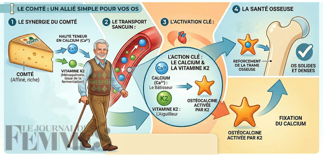 Le fromage de caractère bon pour les os n'est autre que le Comté. Ce produit du Jura est doublement précieux pour les seniors : il possède l'une des plus fortes concentrations en calcium du paysage fromager français (environ 1000 mg pour 100 g). C'est aussi l'un des fromages les plus digestes qui soit car il ne contient quasiment pas de lactose. Pour bénéficier de ses bienfaits, les nutritionnistes recommandent de consommer une portion de 30 à 40 grammes de Comté par jour, dès le petit-déjeuner par exemple. C'est le Comté vieux (12, 18 ou 24 mois) qui l'emporte pour la santé osseuse : il est plus affiné et la concentration en K2 est à son maximum.
