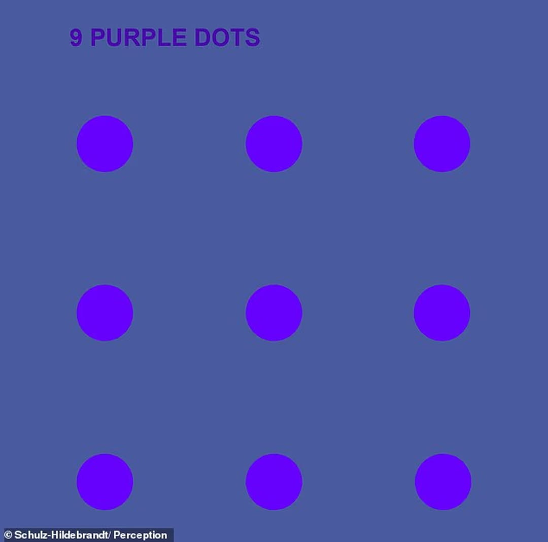 Intrigué, le scientifique décide d'approfondir ce curieux phénomène et met au point une illusion composée de neuf points violets disposés sur un fond bleu. Le principe est simple : lorsqu'on fixe l'un des points, il paraît nettement violet, tandis que les points alentour semblent bleus, alors que tous sont rigoureusement de la même couleur, c'est-à-dire violet. Pour en faire l'expérience vous-même, rien de plus simple : observez l'image de près, puis éloignez-vous progressivement de votre écran. À mesure que la distance d'observation augmente, un plus grand nombre de points reprennent leur apparence violette. Le scientifique démontre dans la revue Perception que le cerveau nous induit en erreur sur les couleurs que nous croyons voir.