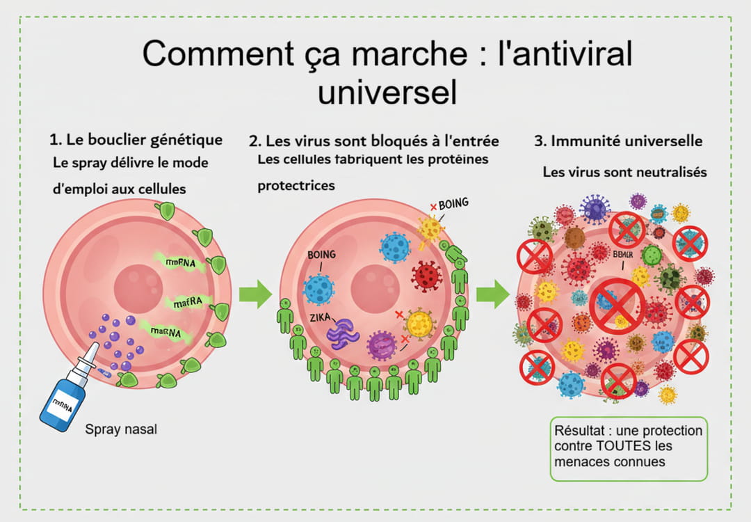 Tout part d'une découverte fascinante réalisée par le Pr Dusan Bogunovic, professeur d'immunogénétique à l'Université Columbia à New York. En étudiant des individus dotés d'une mutation génétique rare (une déficience de la protéine ISG15), il a remarqué qu'elles étaient naturellement protégées contre tous les virus. Leur secret ? Leur corps maintient leur système immunitaire en état d'alerte permanent, créant un bouclier qui empêche les virus de s'installer. Pour offrir ce "super-pouvoir" au reste de la population, son équipe a créé un médicament (administré par un simple spray nasal) qui contient le mode d'emploi de cette immunité. Une fois dans le nez, il apprend à nos cellules à fabriquer une brigade de 10 protéines d'élite qui verrouillent l'entrée de l'organisme et bloquent net n'importe quel envahisseur.