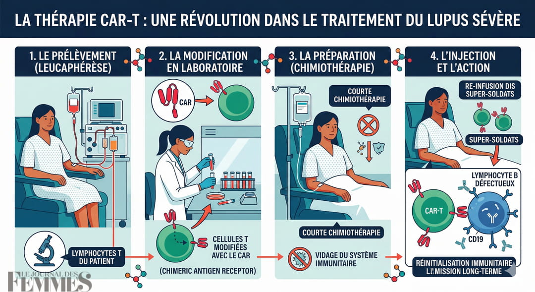 Et si le lupus ne se limitait plus à être "contrôlé", mais pouvait, dans certains cas, s’effacer durablement ? À Clermont-Ferrand, une nouvelle approche thérapeutique s’apprête à être testée chez des patients atteints de formes sévères de cette maladie auto-immune. Encore expérimentale en France, elle suscite beaucoup d’espoir chez les médecins, même si la prudence reste de mise à ce stade et que ses indications restent pour l’instant ciblées. Cette approche est actuellement déployée au CHU Gabriel-Montpied, comme l’a récemment rapporté France 3 Auvergne-Rhône-Alpes.